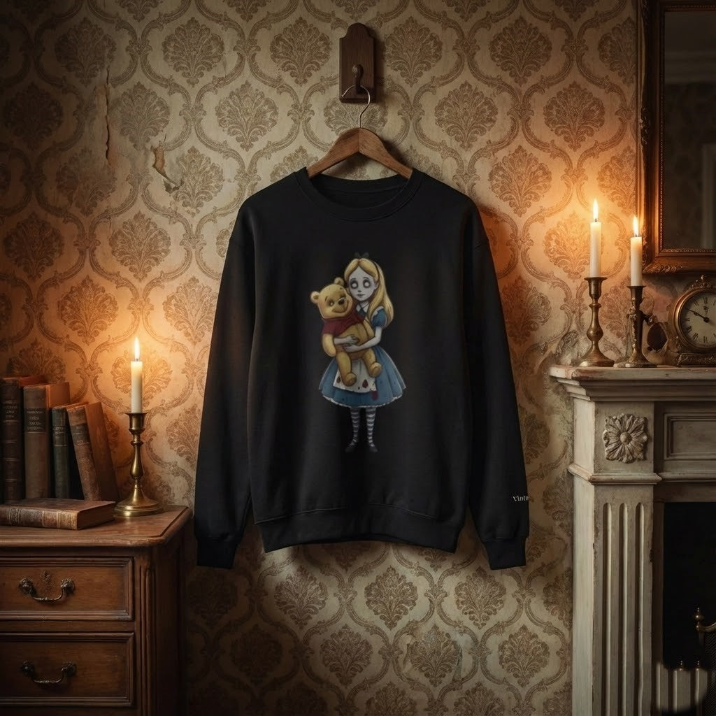 Witness the mashup nobody asked for but everyone fears. The Glitch in the Rabbit Hole Sweater fuses the psychedelic horror of Wonderland with the primal hunger of the 100-Acre Wood. This isn't the storybook you remember—Pooh is feral, Alice is hollow, and the tea has turned to black ichor.