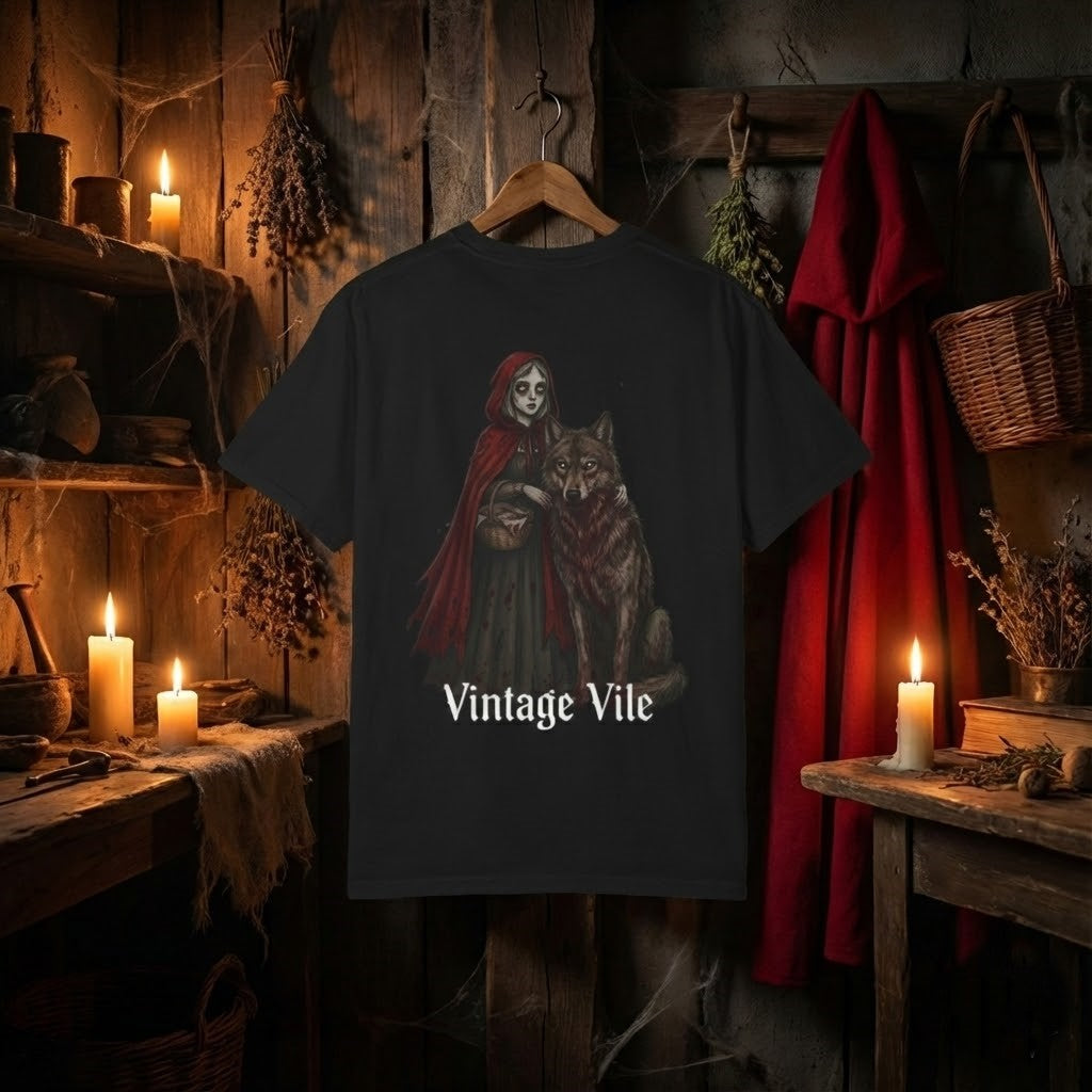 A dark, atmospheric tee that brings the old fairy tale into a modern, eerie edge. Soft garment-dyed cotton drapes comfortably, the faded hues echoing forest shadows. The Little Red Riding Hood horror motif sits bold and bloody at the center — a whispered story turned into wearable art. Slip this on for late-night walks, spooky season gatherings, or when you want to channel a moody, storybook energy. The relaxed fit and substantial midweight fabric feel lived-in from the first wear, while double-needle stitching and tubular knit keep it durable through repeat outings. This is for people who love twisted folklore, lantern-lit trails, and clothing that tells a darker story.